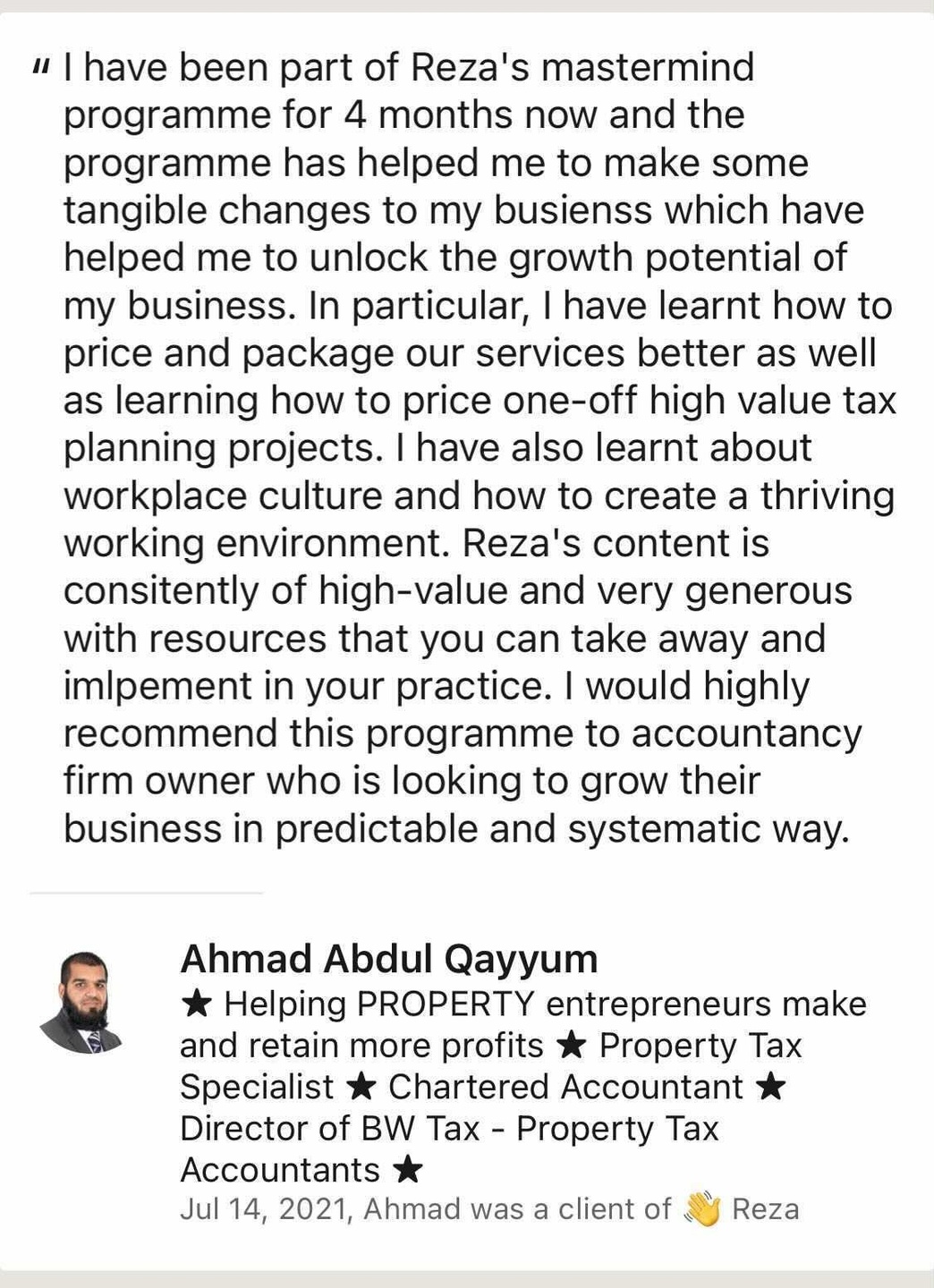 Small firm owners that want to shortcut the time it takes to acquire the knowledge to do these things successfully. It’s for people that are ambitious and understand the benefits of working with a mentor to acquire knowledge and get results fast.